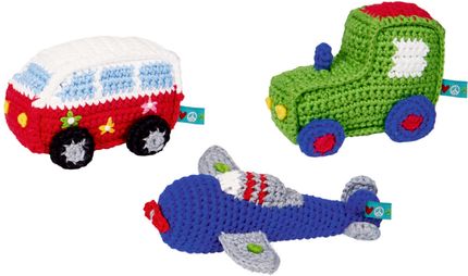 Häkel-Rassel Bulli,Traktor,Flugzeug,sort. BabyGlück