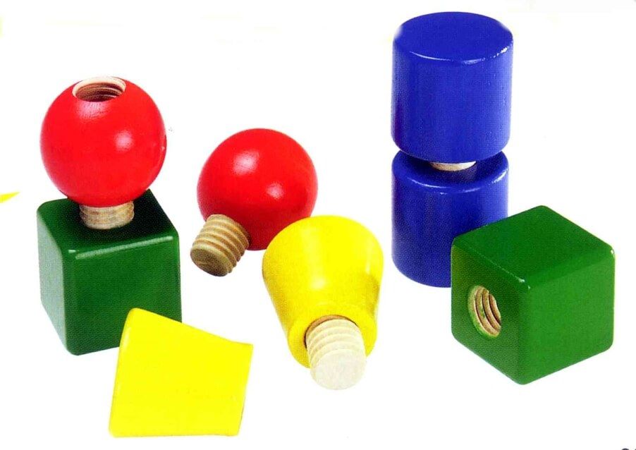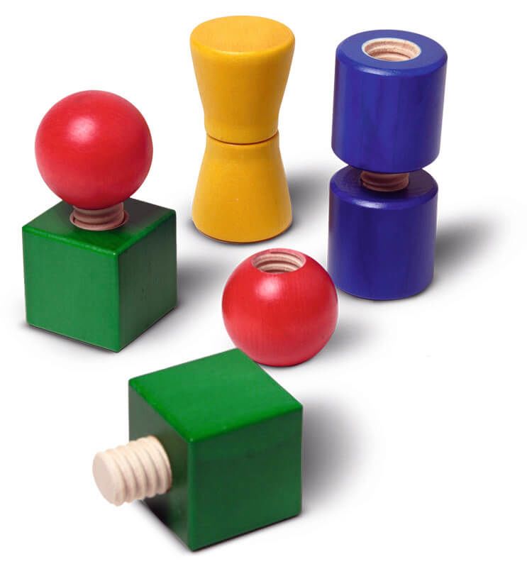 4 zusammengesetzte gut greifbare Formen lassen sich auf vielfältige Art und Weise zusammenschrauben. Bestens zur Entwicklung der Motorik. Unterstützt und fördert die manuelle Fertigkeit im Kleinkindalter. Die Schrauben und Muttern lassen sich vielfältig kombinieren und schulen spielerisch die Motorik. Die wertigen Hölzer sind mit Farben auf Wasserbasis lackiert und somit absolut speichelecht. Zum Lieferumfang gehören 8 Teile.