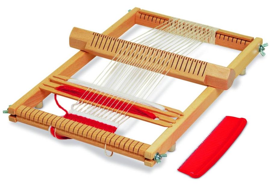 Schulwebrahmen Inesmit angefangener Webarbeit Webbreite 20 cm, Länge: 35 cm Ein praktischer Kleinwebrahmen, auf dem auch längere Teile hergestellt werden können, da Kett- und Warenbaum drehbar sind. Zubehör:2 Schiffchen, Anschlagkamm, Webanleitung mit abgebildetem Webmuster. Mit Prädikat "spiel gut" ausgezeichnet.