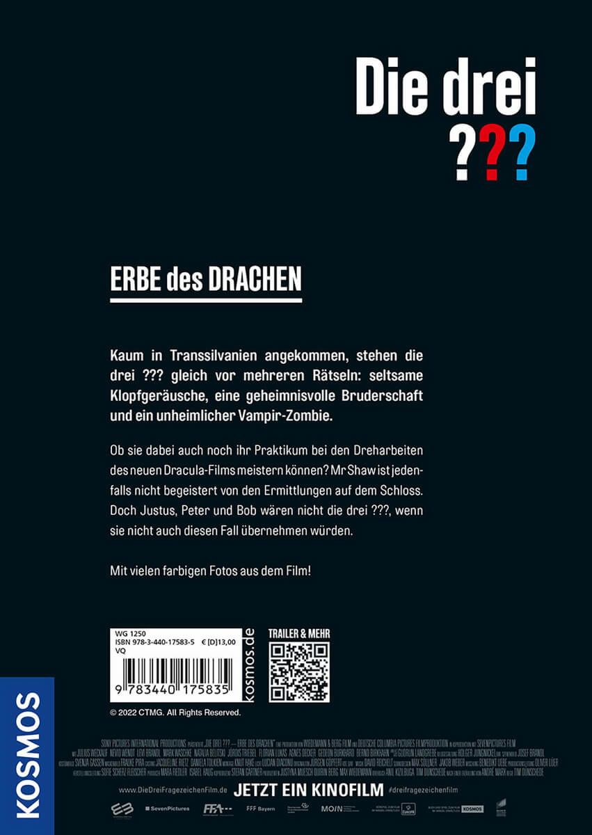 Die drei ??? übernehmen jeden Fall. Ein Leseabenteuer mit Kino-Feeling: Noch vor dem Start von „Erbe des Drachen“, dem dritten Die drei ???-Kinofilm, erscheint bei Kosmos das Buch mit der spannenden Story. Ein Praktikum am Filmset von „Dracula Rises“ führt die Detektive tief hinein nach Transsilvanien und auf die Spur des mysteriösen Drachenordens. Nervenkitzel mit Gruselfaktor, illustriert mit tollen Fotos aus dem Film.