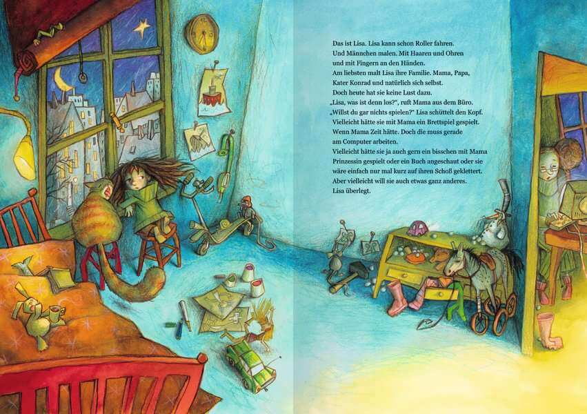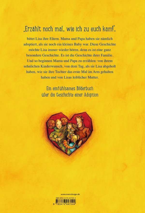 Als Lisa noch ein Baby war, haben Mama und Papa sie adoptiert. Sie fühlt sich rundum wohl bei ihren Adoptiveltern, doch trotzdem möchte sie immer wieder wissen, wie es war, als sie damals zu ihnen gekommen ist und warum ihre erste Mutter sie überhaupt zur Adoption freigegeben hat. Und so beginnen Mama und Papa zu erzählen: von ihrem sehnlichen Kinderwunsch, von dem Tag, als sie Lisa abgeholt haben, und von Lisas leiblicher Mutter.Als Lisa noch ganz klein war, haben ihre Eltern sie adoptiert. Weil Lisa sich daran nicht mehr erinnern kann, möchte sie ganz genau wissen, wie es war, als sie damals zu ihnen gekommen ist. Also beginnen Mama und Papa zu erzählen:Mama und Papa haben sich schon immer ein Kind gewünscht. Doch so sehr sie es sich auch gewünscht haben, in Mamas Bauch hat sich nichts geregt. So kamen sie auf die Idee, ein Kind zu adoptieren, das keine Eltern hat und das bei ihnen aufwachsen kann. Als dann nach einiger Zeit der Anruf kam, dass sie die kleine Lisa abholen können, waren Mama und Papa ganz aufgeregt und haben sich riesig gefreut. Mama erinnert sich noch ganz genau an den Moment, als sie Lisa das erste Mal im Arm gehalten und ihr das Fläschchen gegeben hat. Gerne sieht Lisa sich das Fotoalbum an, das Mama und Papa für sie gebastelt haben, denn es erzählt ihre Geschichte. Doch eins fehlt darin noch, findet Lisa: ein Bild von ihrer ersten Mutter, von der Frau, bei der sie im Bauch war und die damals noch zu jung war, um sich selbst um Lisa zu kümmern. Und so malt Lisa ein Bild von ihr und klebt es zusammen mit Papa in das Fotoalbum. „Jetzt sind alle drin“, freut sie sich.