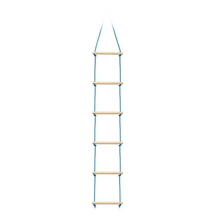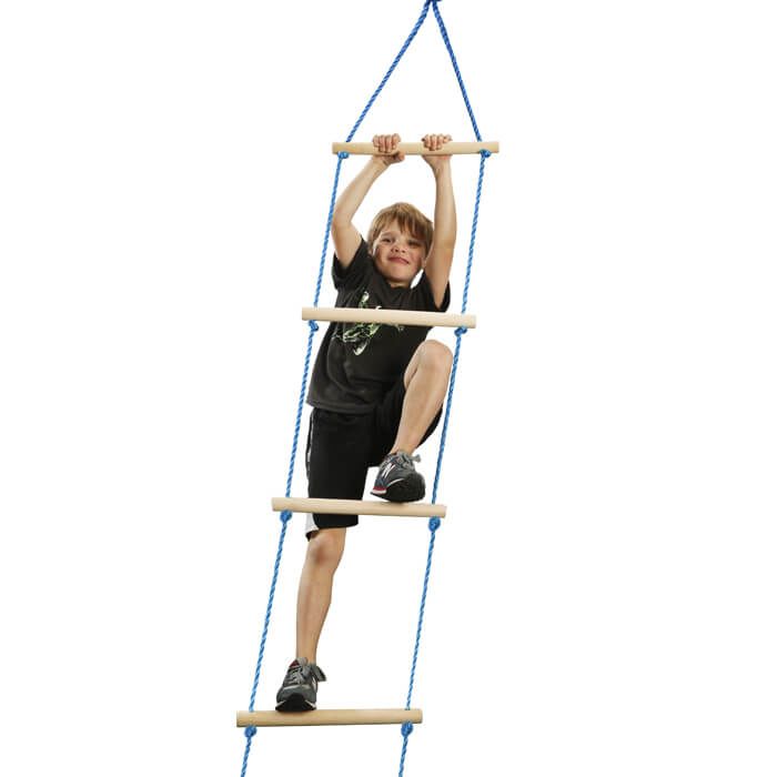 L. 2,5m, Holzsprossen: Ø 3cm, B. 38cm max. Belastbarkeit: 80kg Robuste, vielseitige Strickleiter aus witterungsbeständigem Kunststoff-Seit mit 6 runden, stabilen Sprossen aus Holz. Kann ohne Werkzeug an der Ninjaline, Schaukelgestellen, Baumhäusern oder Ästen befestigt werden.