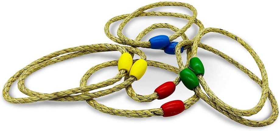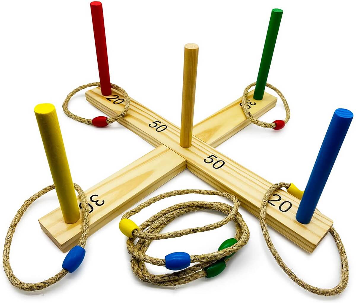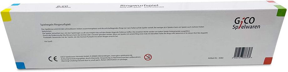 Ringwurfspiel aus Holz zum Zusammenstecken. Bestehend aus 1 Wurfkreuz (38x38x21cm) mit 5 senkrecht stehenden Zielstäben aus FSC zertifiziertem Pinienholz, 5 Wurfringe aus Seil verschiedenfarbig markiert. Inkl. Anleitung im 4c Karton verpackt.