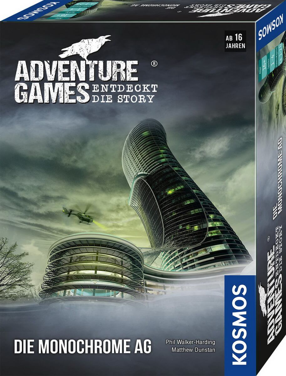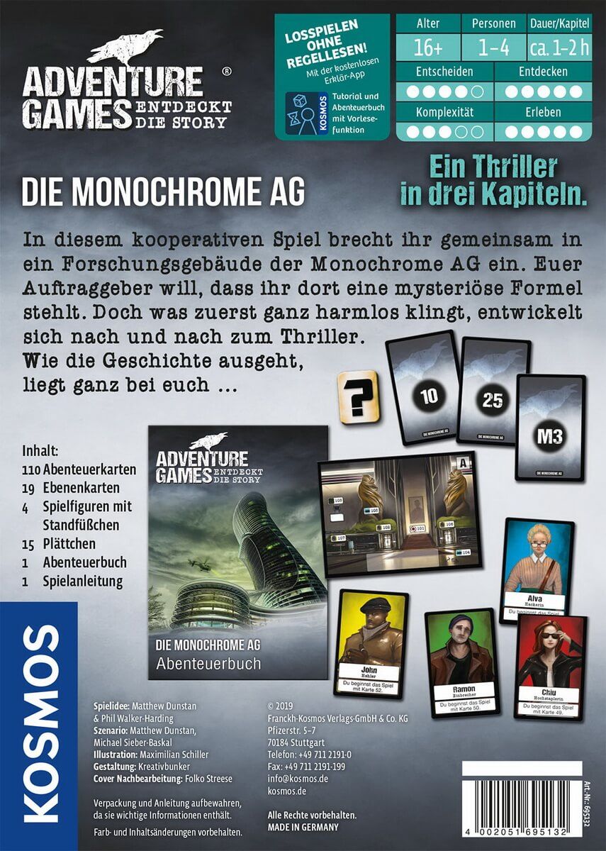 Das Abenteuer geht los! Die Spieler brechen in diesem Thriller in ein Forschungsgebäude der Monochrome AG ein. Dort angelangt sind sie auf sich allein gestellt. Ähnlich wie in einem PC-Spiel müssen die Spieler nun Orte erkunden, Gegenstände miteinander kombinieren, Hinweise finden und sich mit Personen unterhalten. Nur so kommen sie Schritt für Schritt den Zusammenhängen auf die Spur. Ein kooperatives Gesellschaftsspiel in drei Kapiteln ab 16 Jahren, mit einfachen Regeln und spannend bis zum Schluss! Inhalt: 1 Abenteuerbuch, 18 Ebenentafeln, 110 Karten, 1 Anleitung, 4 Spielfiguren, 2 Zip-Beutel