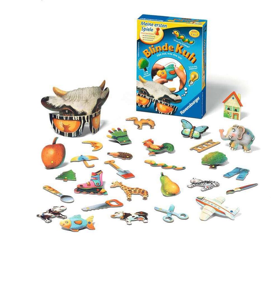 Bei dem Kinderspiel Blinde Kuh heißt es die Kuhmaske aufsetzen und los geht's: Die Kinder ziehen bei dem Tastspiel je einen Gegenstand und mit viel Fingerspitzengefühl ertasten sie, was sie in der Hand haben. Wer die meisten Formen errät, hat gewonnen. Die vierzig kindgerechten Formen fördern so spielerisch den Tastsinn und die Fantasie der Kinder.Bei dem Ravensburger Klassiker Blinde Kuh sind die Formen nach Schwierigkeitsgrad gekennzeichnet, so dass sich die Herausforderung langsam steigern lässt. Natürlich sind die Formen von Blinde Kuh für zahlreiche Spielvarianten nutzbar: Als Bilder- oder Tastlotto, als Schablonen zum Malen oder als Grundlage für Geschichten, die die Kinder dann erzählen. So eignet sich dieses Spiel als Einzelspiel oder zur spielerischen sozialen Interaktion der Kinder miteinander. Blinde Kuh ist eine schöne Beschäftigung für Kinder und ein tolles Geschenk.