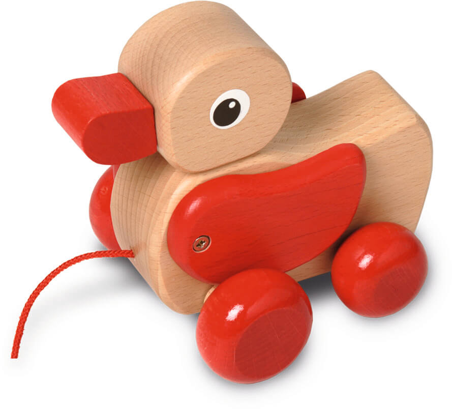 Lustiges Ziehtier, welches mit Kopf und Flügeln wackelt. Sogar ein richtiges Knatter-Geräusch ist zu hören. Eine wunerschön verarbeitete Figur aus besten Hölzern. Unsere Quak-Wack watschelt ihrem Begleiter fröhlich geräuschvoll schnatternd hinterher und bewegt dabei Kopf und Flügel. Hochwertiges Buchenholz vereint in handwerklicher Schreinerskunst. Traditionell und klassisch. Die Oberflächen sind auf Wasserbasis lackiert und absolut speichelecht. Mit Prädikat "spiel gut" ausgezeichnet.
