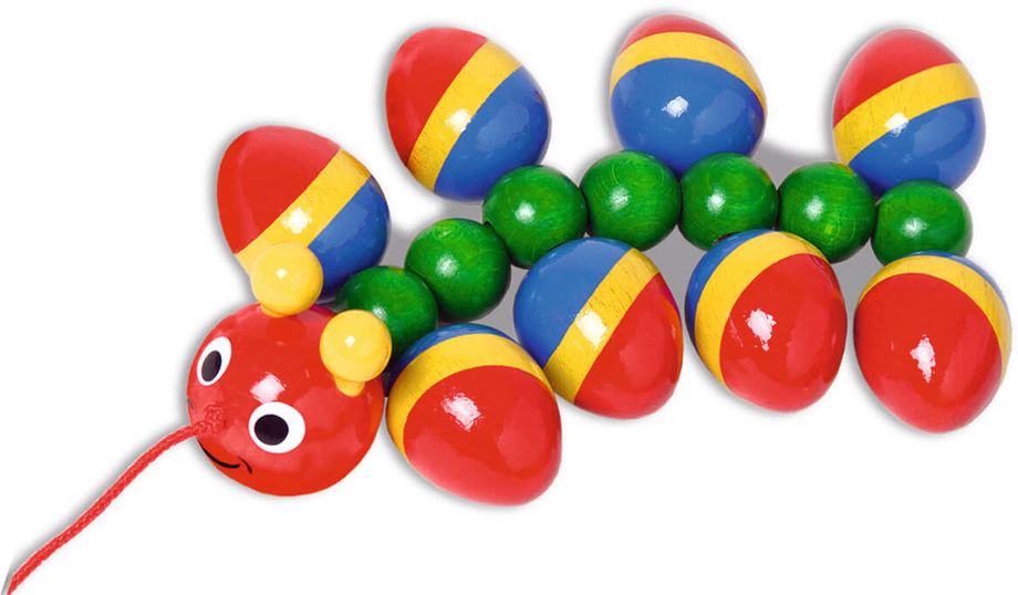 Unser Raupe ist quirlig und präsentiert beim Hinterherziehen ein tolles und prächtiges Farbenspiel. Über jede Teppichwelle ohne Umzufallen! Unsere bunt schillernde Nachziehraupe Trollinchen schlängelt sich mühelos über alle Hindernisse und präsentiert ein tolles Farbspiel dabei. Hochwertiges Buchenholz mit Farben auf Wasserbasis lackiert und somit absolut speichelecht. Ein muss zum Hinterherziehen.
