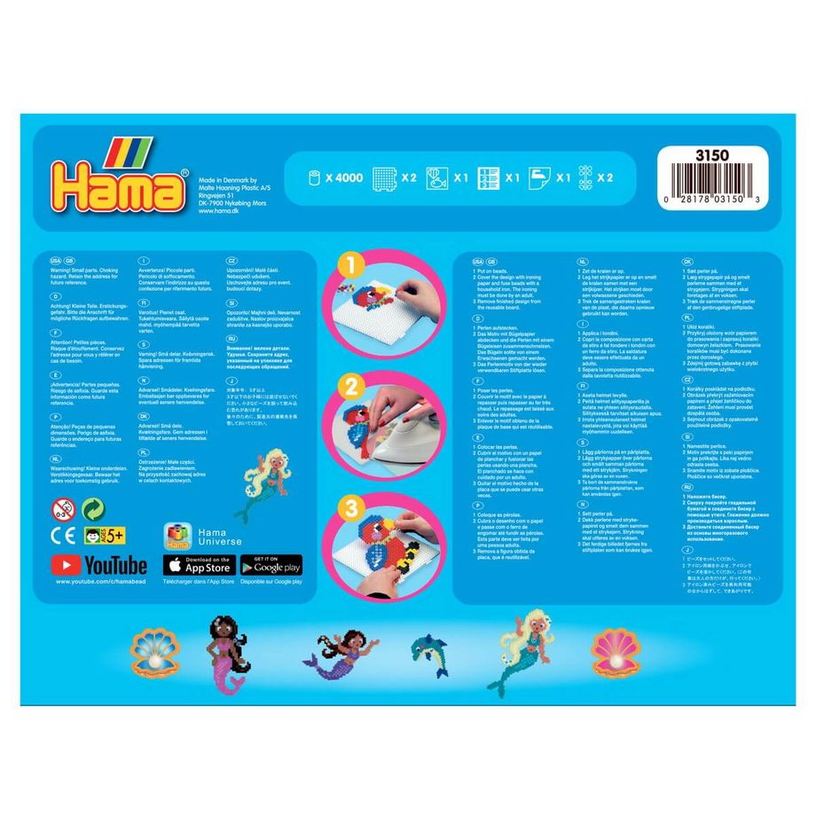 Bügelperlen sind ein ideales kreatives Spielzeug für Kinder ab 5 Jahren. Das Spielen mit den Perlen fördert Kreativität, Farbempfinden und Koordination von Augen und Hand. Die HAMA Geschenkpackung Meerjungfrauen enthält ca. 4000 Bügelperlen, 2 große, quadratische Stiftplatten (zusammensteckbar), 1 HAMA Juwel, Motivvorlage, Anleitung und Bügelpapier. Mit dem Material können schöne Motive von 3 Meerjungfrauen und ihrem Freund dem Delfin gesteckt und verbügelt werden. Mit den kleinen Juwelen entstehen funkelnde Kunstwerke.