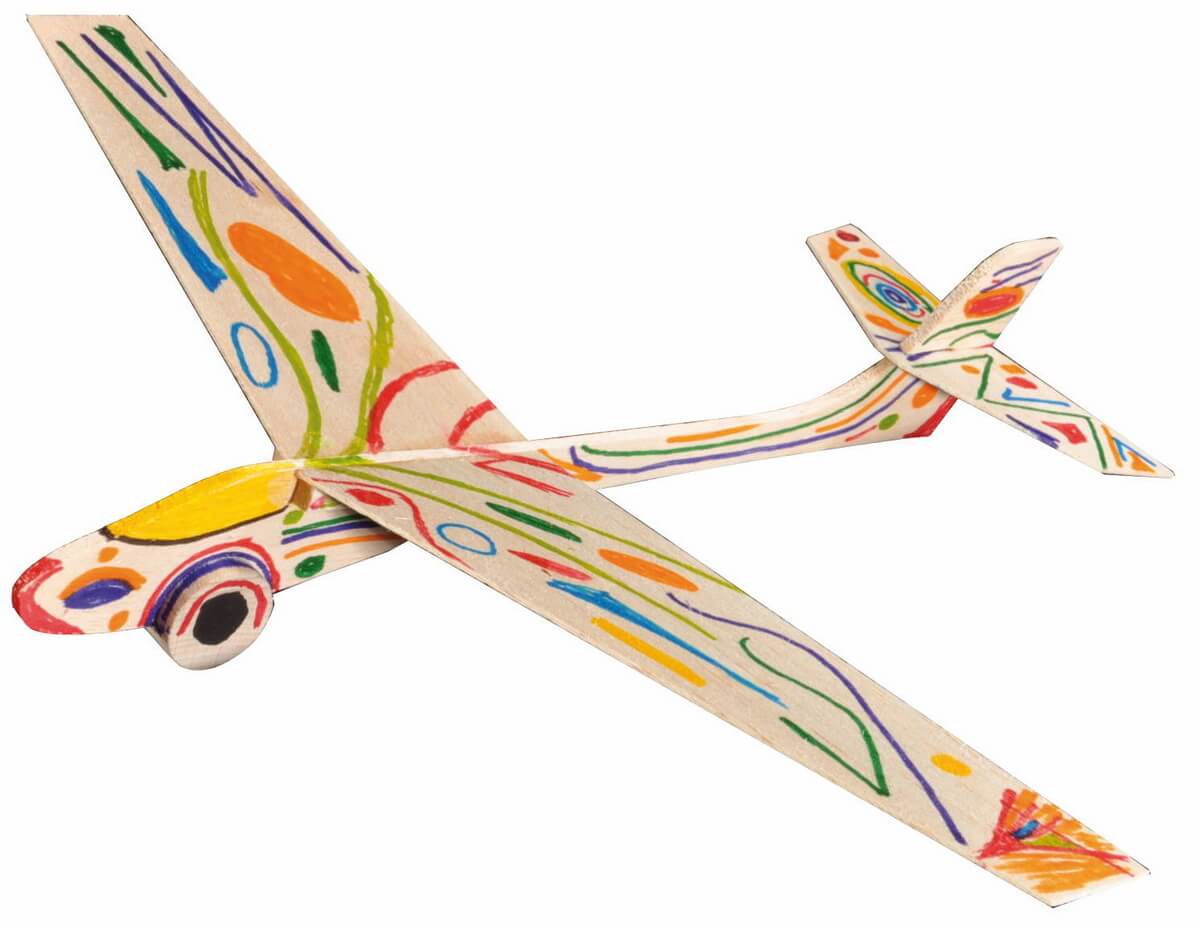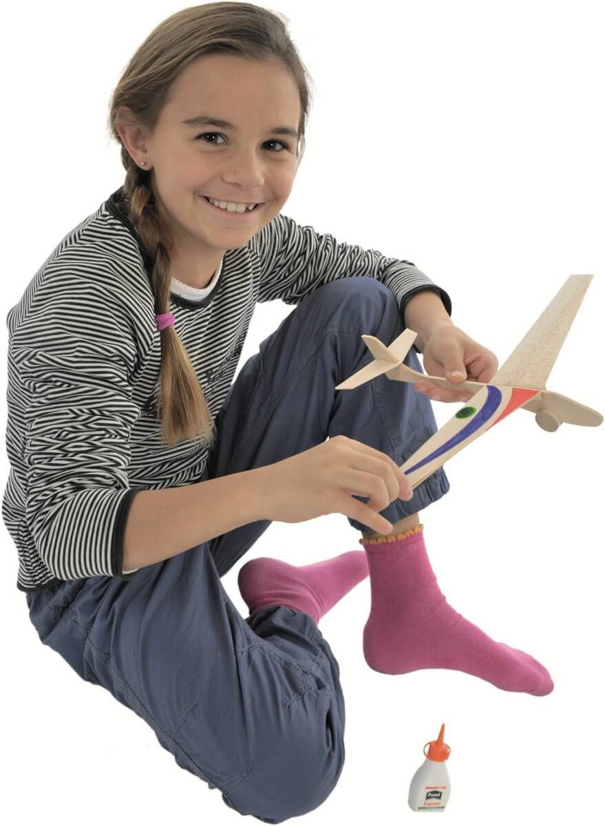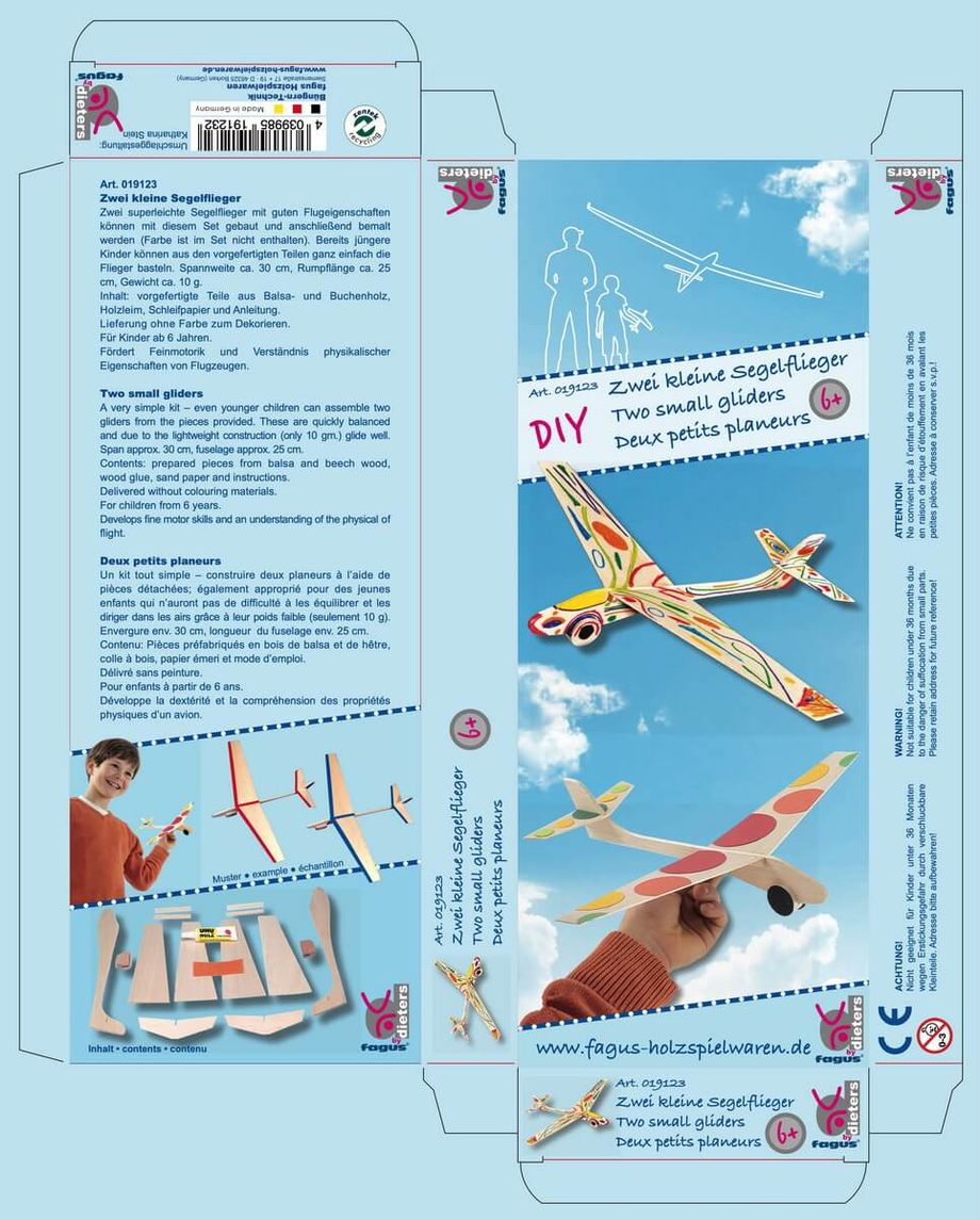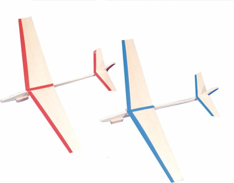 DIY Zwei kleine Segelflieger Die regelrecht aus der Hand gleitenden extrem leichten Flieger aus Balsaholz werden aus vorgefertigten Holzteilen selbst geleimt. Rumpflänge 25 cm, Spannweite 30,5 cm , ca. 10 g. Ab 6 Jahren, fördert Feinmotorik und Verständnis physikalischer Eigenschaften von Flugzeugen.
