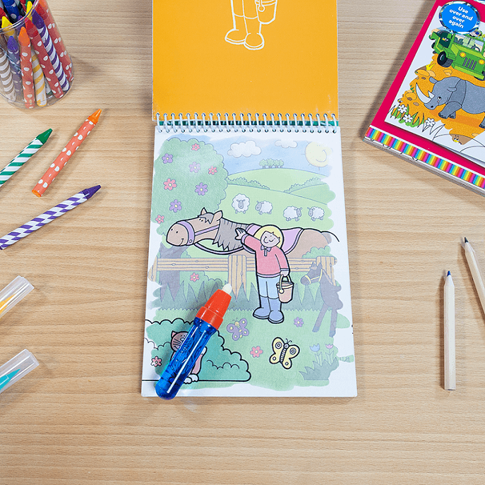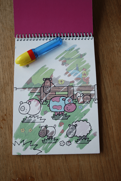 Toller Malspaß zum Wiederverwenden! Mit Water Magic Tiere kannst du 6 tolle Bilder mit dem Wasserstift ausmalen. Es gibt 6 tierische Motive. Und so funktioniert: Fälle den Stift mit Wasser und male die Bilder aus. Die unsichtbaren Farben erscheinen beim Malen mit dem Wasserstift. Werden die Bilder wieder getrocknet, können sie beliebig oft ausgemalt werden. Ideal für unterwegs. Für Kinder ab 3 Jahren geeignet! Inhalt: - 6 wiederverwendbare Bilder - Wasserstift