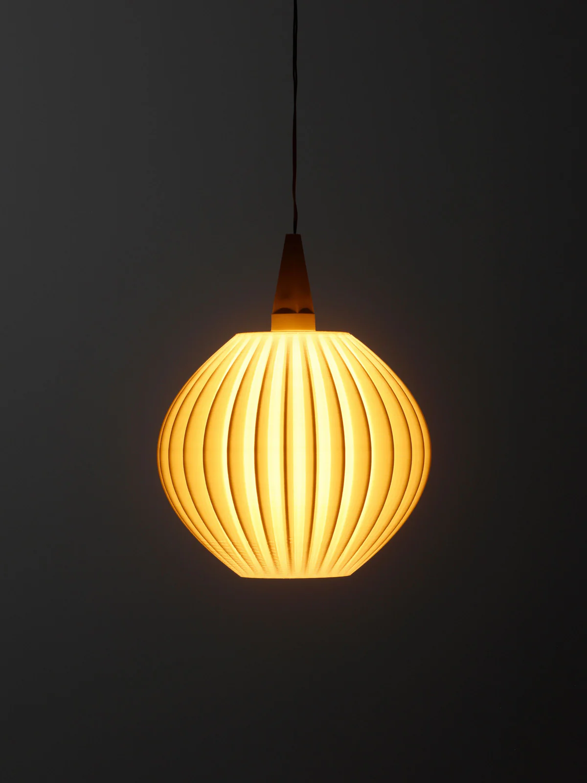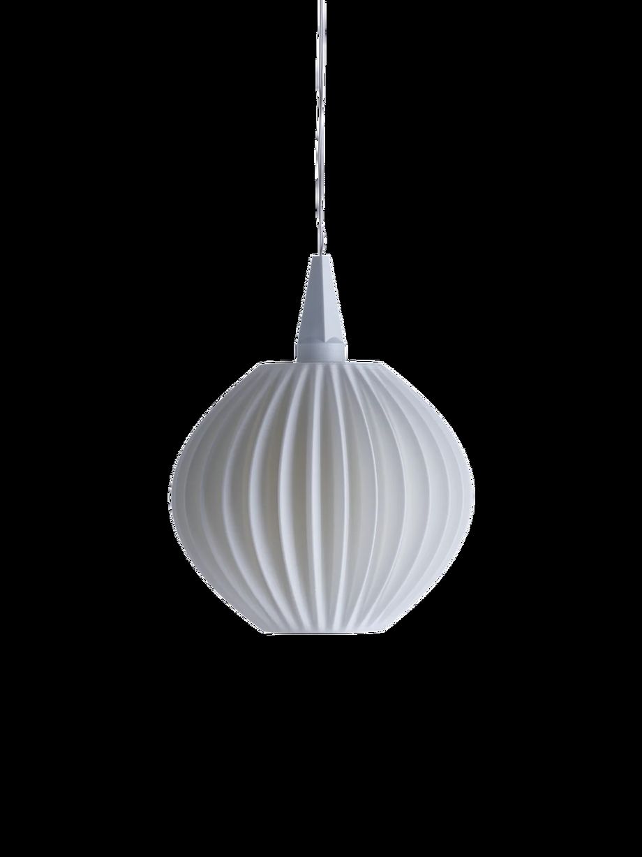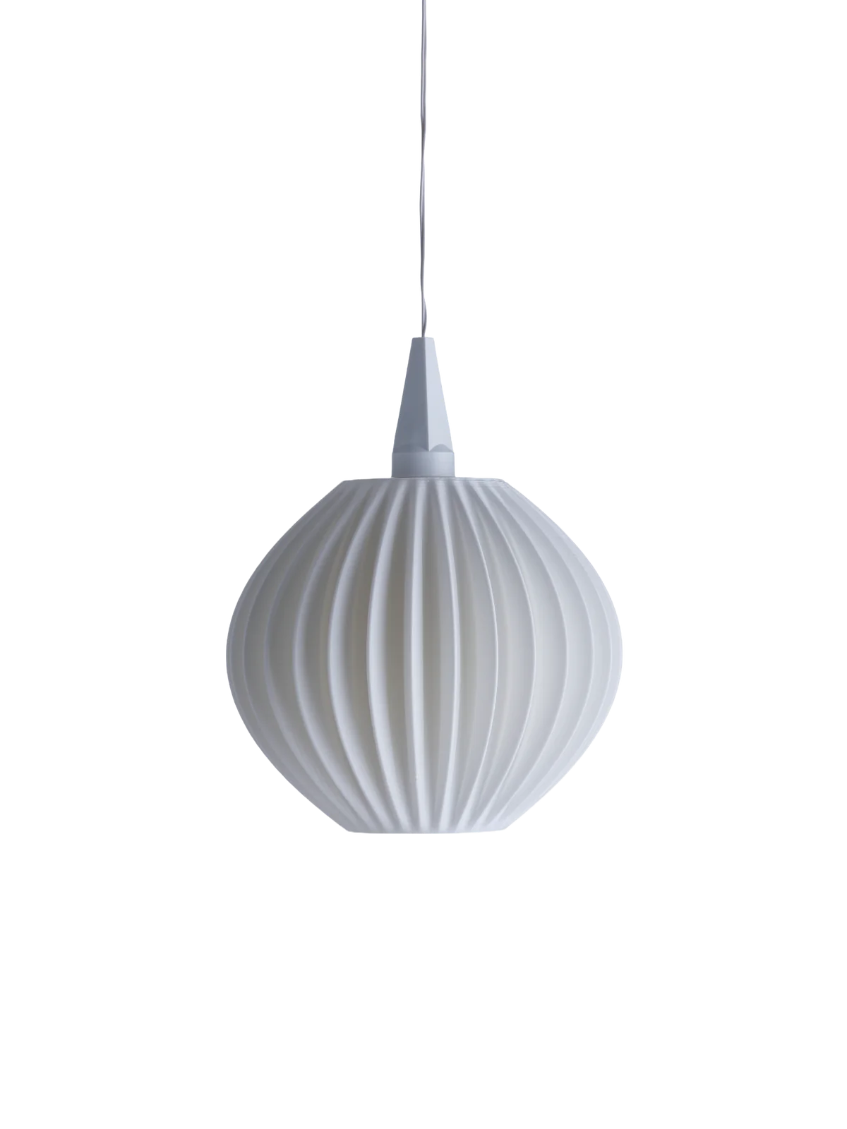 "Orphelia" besticht durch ihre sanft gewölbten, organischen Formen, die an weiches Gewebe erinnern. Diese einzigartige Struktur verleiht der glatten, weißen Oberfläche des Lampenschirms eine