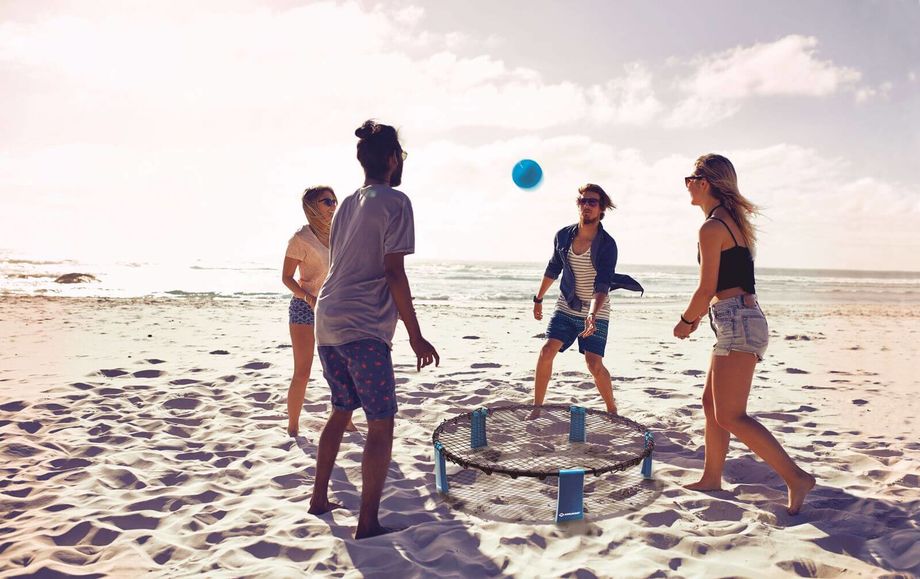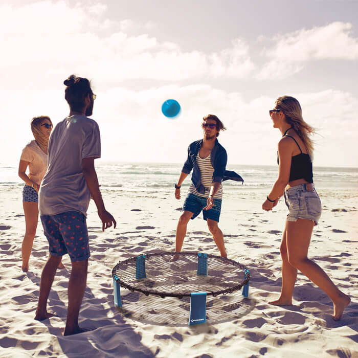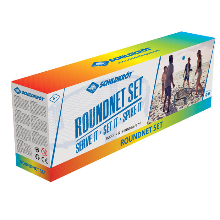 Der neue ultimative neue Fun-Sport für jung und alt, für Freunde oder Familie. Am Strand, im Park oder auch Indoor: das rasante Spiel begeistert jeden man findet schnell interessierte Mitspieler. Zwei Teams mit je 2 Spielern treten gegeneinander an. Alle stehen gleichmäßig verteilt um das Netz herum. Zum Aufschlag wird der Ball mit der flachen Hand auf das Netz geschlagen, so dass er in die gegnerische Seite fliegt. Das gegnerische Team darf sich nun den Ball bis zu zwei Mal gegenseitig zu zuspielen, bevor er wieder ins Netz geschlagen werden muss. Ziel ist es, dass der so geschlagene Ball möglichst nicht von der gegnerischen Mannschaft erreicht wird. Nach dem Aufschlag darf sich jeder Spieler völlig frei rund um das Netz bewegen. Dies macht das Spiel so rasant. Mit kurzen und langen Pässen, mit vorgetäuschten Angriffen und anderen Tricks versucht man den Gegner aus der Reserve zu locken. Schafft dieser es nicht den Ball zurückzuspielen und fällt der Ball auf den Boden, bekommt das eigene Team 1 Punkt. Sobald ein Spieler behindert wird, erhält dieser ebenfalls 1 Punkt. Wer als erster 21 Punkte erreicht hat und dabei mit 2 Punkten Abstand in Führung ist, hat das Match gewonnen. Das Set beinhaltet alles für den sofortigen Start eines Roundnet-Matchs: komplettes Roundnet Netz (Ø 90cm, ca. 20cm hoch), 1 Trainingsball (Ø11cm), 2 Wettkampfbälle (Ø9cm, 0,5 bar), Ballpumpe mit Nadel, Netztasche zum Verstauen und Transport. Gewicht komplettes Set: 1,4kg