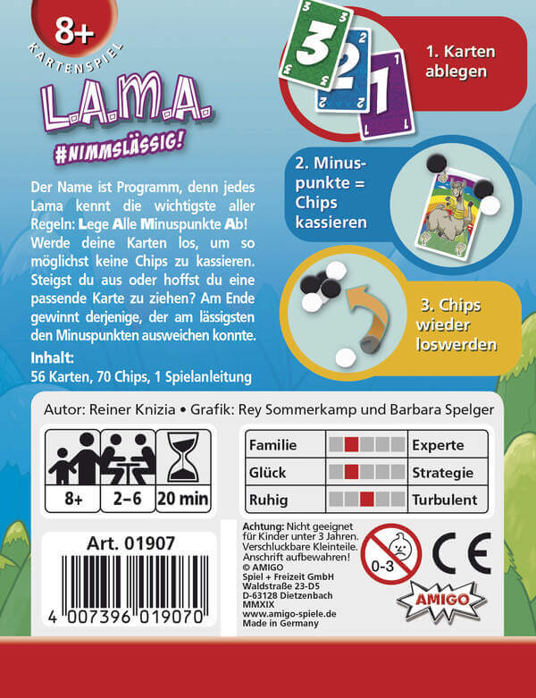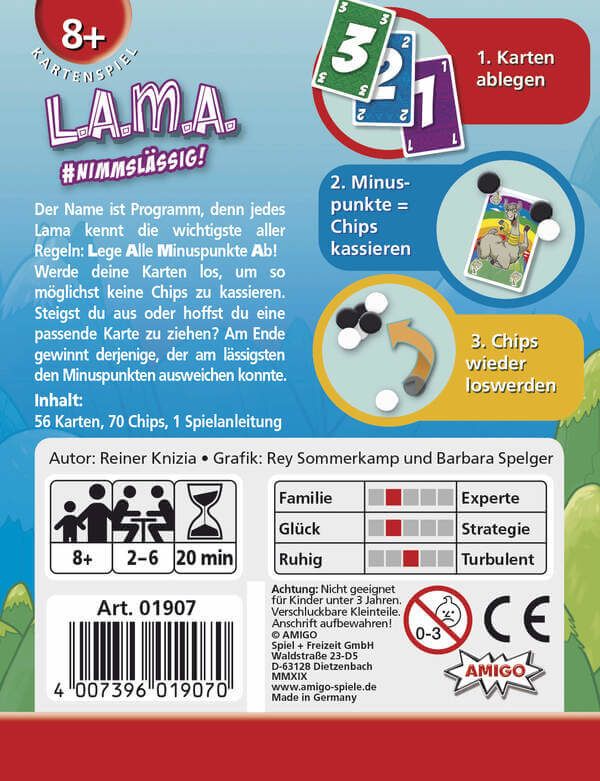 Jedes Lama kennt die wichtigste aller Regeln: Lege Alle Minuspunkte Ab! Die Spieler versuchen, ihre Karten loszuwerden, um so möglichst keine Chips und damit Minuspunkte zu kassieren. Aussteigen oder darauf spekulieren eine passende Karte zu ziehen? Keine leichte Entscheidung! Am Ende gewinnt derjenige, der am lässigsten den Minuspunkten ausweichen konnte.