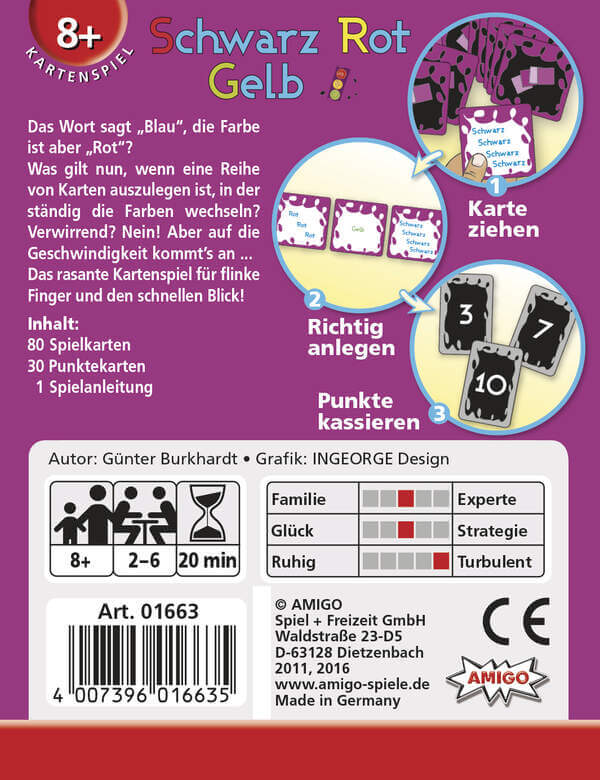 Ist „Grün“ nun rot oder doch grün? Das Wort sagt „Grün“, die Farbe ist aber „Rot“. Und das ist genau die Schwierigkeit bei diesem Spiel. Es geht darum, eine Reihe von Karten auszulegen, in der ständig die Farben wechseln. Und das alles so schnell wie möglich! Der Spieler mit den meisten Punkten gewinnt das Spiel.