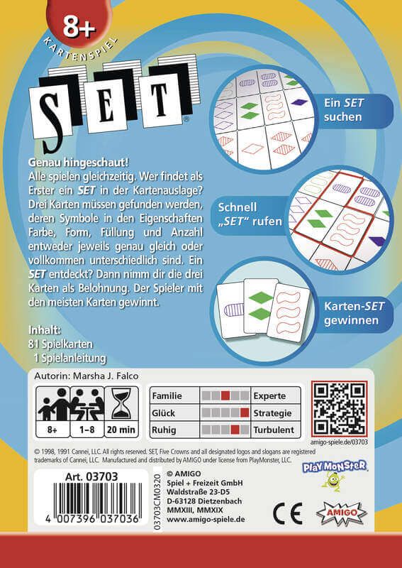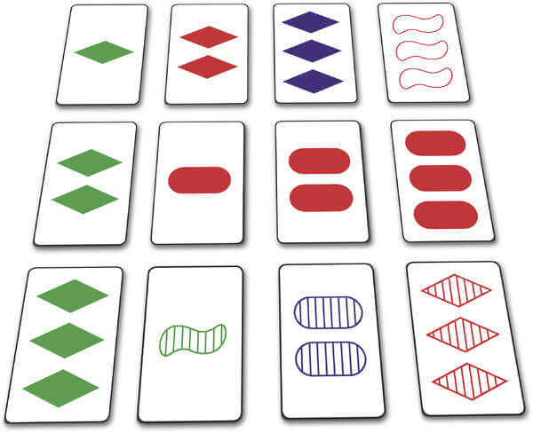 Alle spielen gleichzeitig. Wer findet als Erster ein SET in der Kartenauslage auf dem Tisch? Dazu müssen die Symbole auf drei Karten die richtige Farbe, Form, Füllung und Anzahl haben. Wer ein SET entdeckt hat, darf sich die Karten als Belohnung nehmen. Wer am Ende die meisten Karten hat, gewinnt.SET® – eine Herausforderung für bis zu 8 Spieler!
