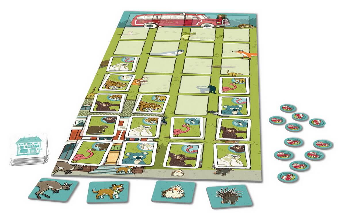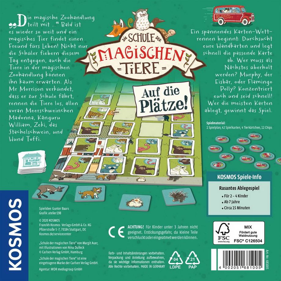 Bei diesem Brettspiel geht´s rasant zu! Wer in den Bus von Mister Morrison einsteigen möchte, muss sich beeilen! Zeki das Stachelschwein, Polly der Flamingo, William das Känguru und Madonna das Meerschweinchen freuen sich schon darauf, bald ihre Schulkinder kennenzulernen und rennen los. Doch bevor die Fahrt beginnen kann, müssen sie noch an Eisbär Murphy, Leander dem Leoparden und vielen anderen Tieren vorbei. In dem turbulenten Kinderspiel ab 7 Jahren beginnen alle Spieler gleichzeitig, ihre Karten nach Wegkarten zu durchsuchen und wie bei Domino anzulegen. Die richtige Karte ist nicht dabei? Dann wird im Stapel weitergesucht. Die Runde ist dann beendet, sobald ein Tier mit acht Karten im Bus sitzt. Ein rasanter Spielspaß mit den Figuren aus „Die Schule der magischen Tiere“ und ein tolles Geburtstagsgeschenk!
