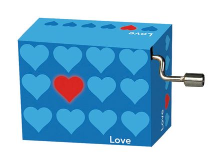 Kurbelspieluhr in Box, Herz auf gelb, Rand grün, Lovers Conc