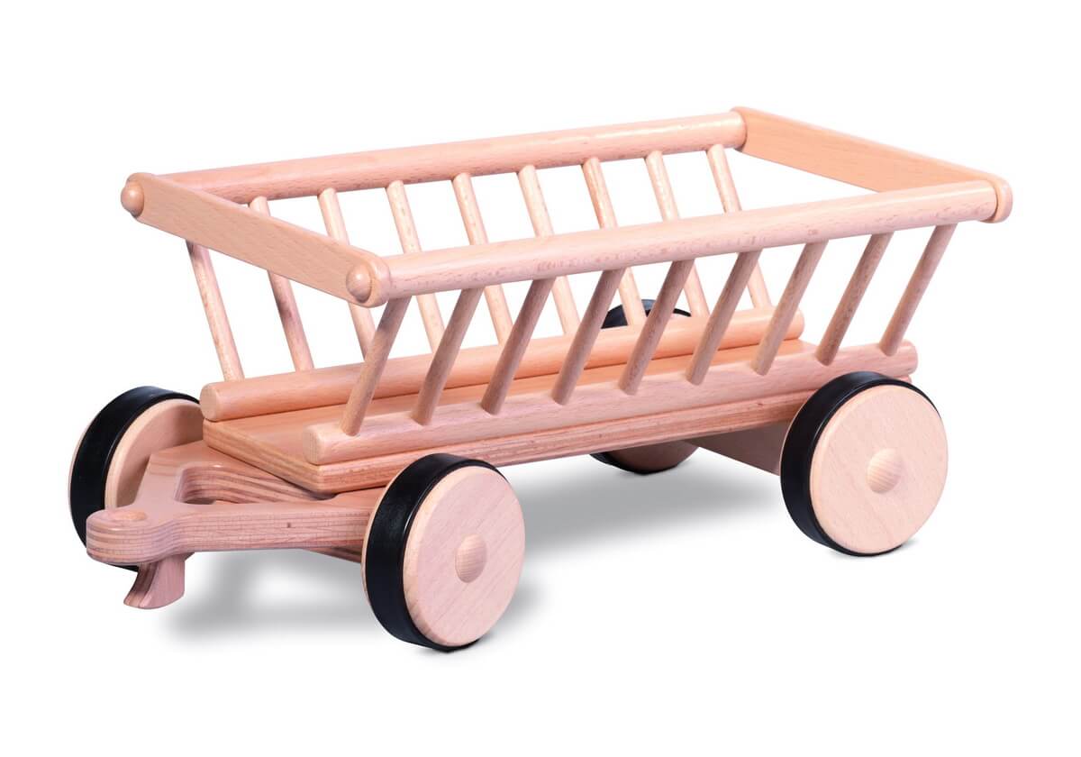 Anhänger mit 2 Stahlachsen, passend zu den Traktoren aus der Creamobil-Serie. Anhänger aus Buchenholz, versehen mit 2 Stahlachsen und Anhängekupplung. Ob Bauklötzchen oder Heu, hier kann so einiges verladen werden. Anhänger wird einfach am Traktor eingefädelt und hängt dadurch nicht gleich bei jeder Teppichwelle ab! Gesamt-Länge 38cm. Mit Prädikat "spiel gut" ausgezeichnet.