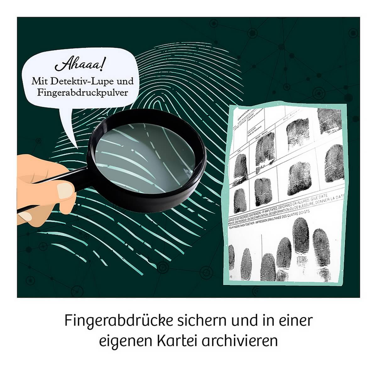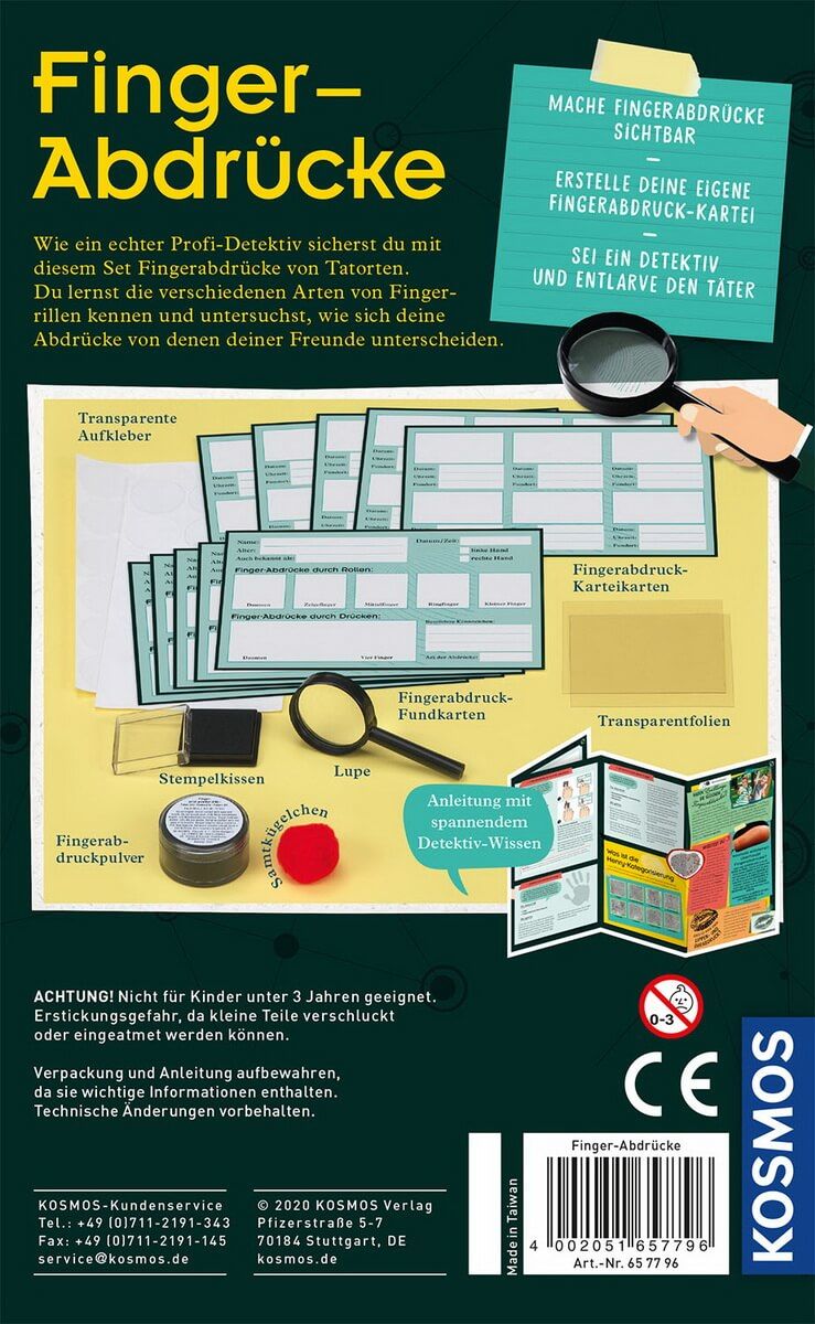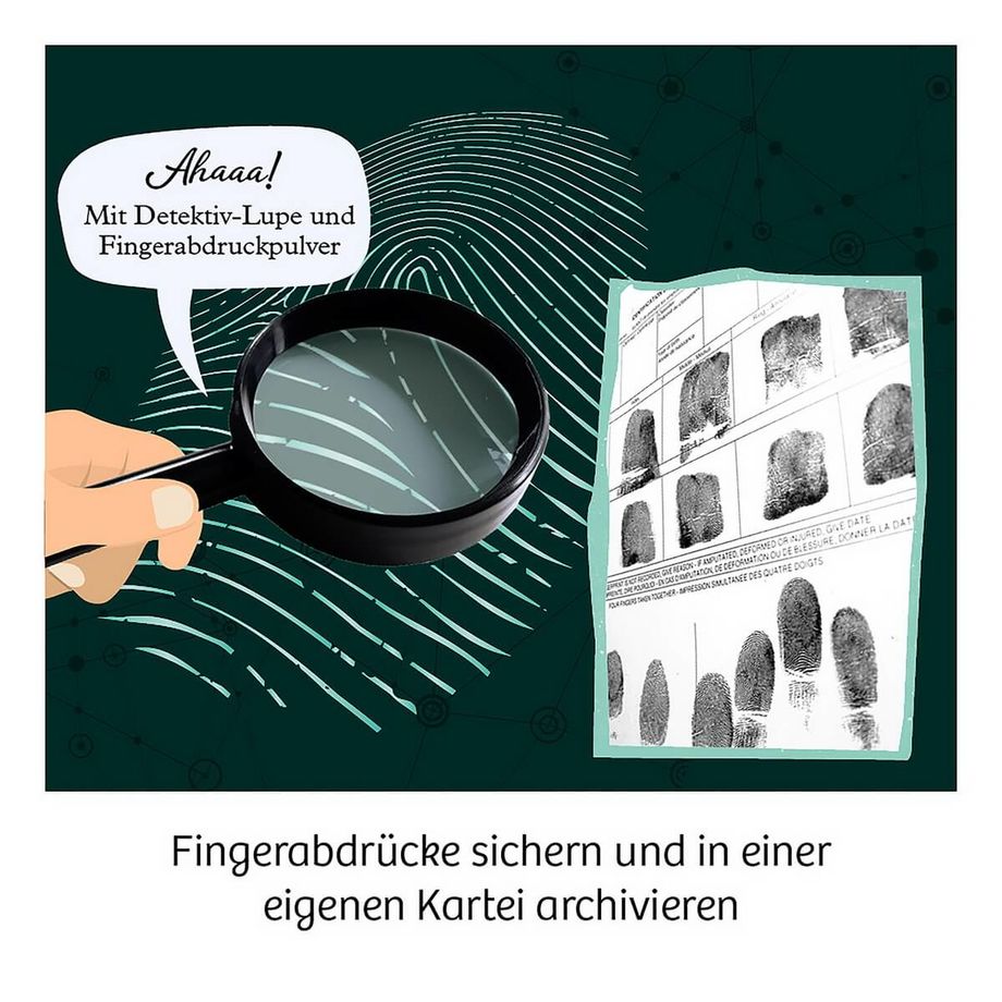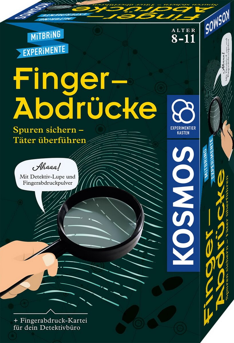 Übeltäter aufgepasst! Warum ist plötzlich die Tür zum Süßigkeitenschrank offen? Wer hat den letzten Keks aus der Dose geklaut? Ab jetzt kommen schlaue Kids dem Rätsel auf die Spur! Ausgestattet mit Fingerabdruckpulver, Lupe, Stempelkissen, durchsichtigen Aufkleber und Co. lösen Kinder mit diesem KOSMOS Experimentierset wie im Krimi ihre ersten Detektivfälle. Sie können mit Karteikarten verdächtige Fingerabdrücke archivieren und durch Vergleichen der Funde am Tatort den Täter überführen. Die Anleitung zeigt die unterschiedlichen Methoden, mit denen Fingerabdrücke abgenommen und verglichen werden, erklärt den kleinen Detektiven, wie durch Hände Beweise entstehen und warum unsere Hautrillen an den Fingern so besonders sind. Ein großer kriminologischer Spaß im Kinderzimmer!