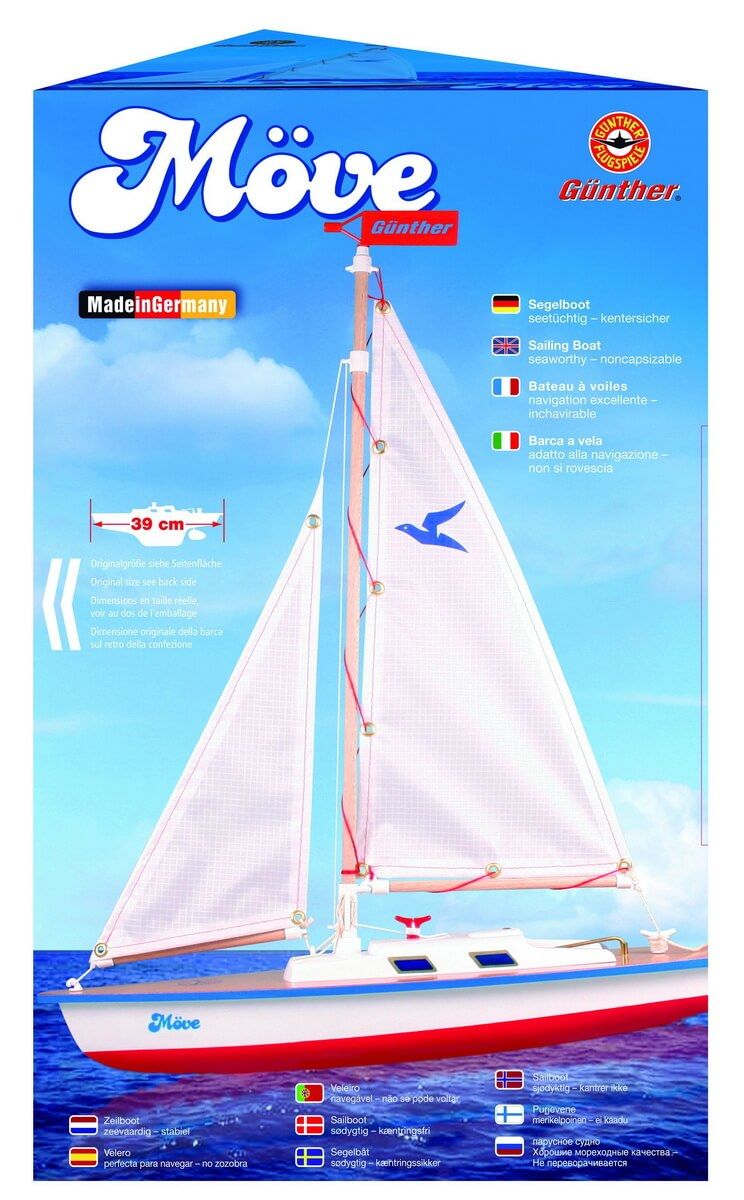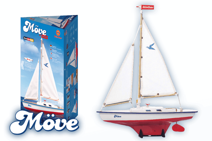 Möwe Segelboot, ein richtiger kleiner Segler. Durch den Ballastkiel ist sie absolut kentersicher, der Rumpf ist dicht wie eine Konservendose, das macht sie unsinkbar. In hochqualitativer kompakter Bauweise gefertigt. Unterwasser-Speziallackierung, mahagonifarbenes Holzdeck. Die Segel und das Ruder sind einstellbar. Großsegel und Fock haben einstellbare Schoten und sind selbstwendend. Mit diesem Boot kann richtig gesegelt werden. Am Strand in knietiefem Wasser oder auf dem Dorfteich. In freiem Gewässer empfiehlt sich eine dünne Drachenschnur zur Sicherung. Segelfertig montiert. Mit ausführlicher Segelanleitung. In attraktiver Geschenkverpackung. Made in Germany! Größe des Modells: ca. 39 x 50 cm.